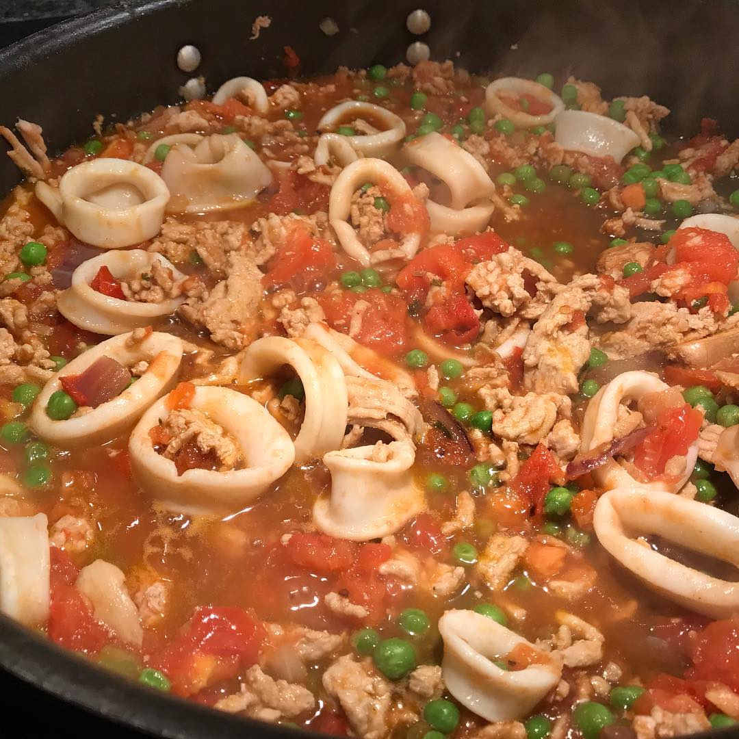 Therapy and hunger time. Sautéed ground chicken and calamari with fresh tomato, onion and peas in a light black bean sauce serve over rice. Very yum. Very satisfying. From Refrigerator to table in 30 mins..or maybe slightly longer. To feed 4 Ingredients 1 pound of ground chicken 1/2 lb of cleaned squid, sliced in ringlets […]